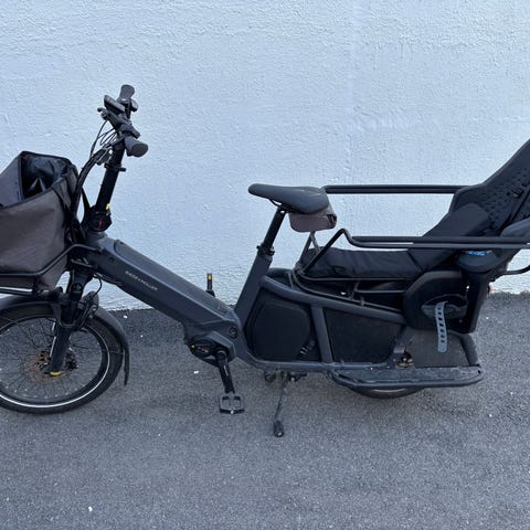 Sykkelen er i fargen svart/curry, stl M47 og kommer med barnegrind, puter, fotbeskytter, fotbrett og liten frontbærer. Med andre ord klar for å frakte barn trygt.