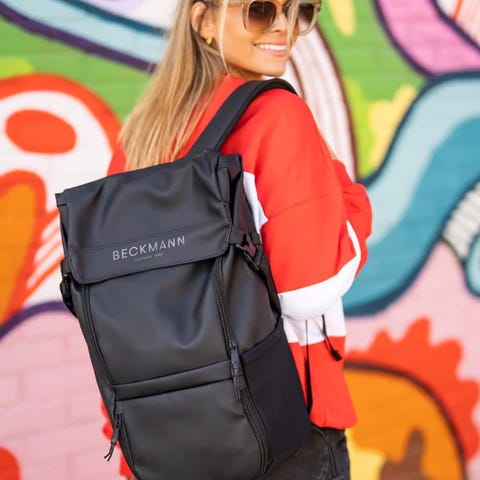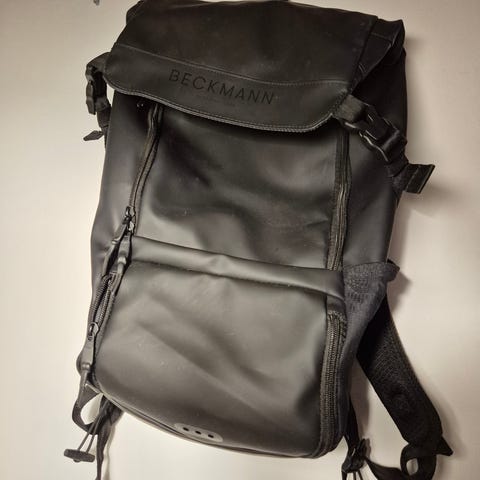 Ryggsekk fra beckmann 22liter som tåler regnvær. Flere smarte lommer samt en netting som gjør at feks sko eller baller kan festes på utsiden av sekken.