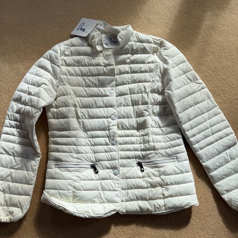 Guess jakke for dame i størrelse XL, men passer best L. Jakken er beige og laget i polyester. Den har vattert design med horisontale og skrå felter, glidelås i front og to sidelommer med glidelås. Kort modell med ribbestrikket kant ved hals og ermer. Passer som lett ytterjakke i overgangssesonger.