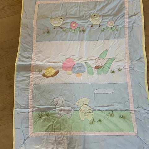 Baby sengetøy med fargerikt mønster i pastellfarger. Tekstilet har motiv med dyr, leker og barnefigurer i ruter og border. Passer til bruk i sprinkelseng eller barnevogn, avhengig av mål. Stoffet er egnet til innendørs bruk på barnerom. Egner seg som sengetøy eller trekk til dyne/teppe for baby eller småbarn.