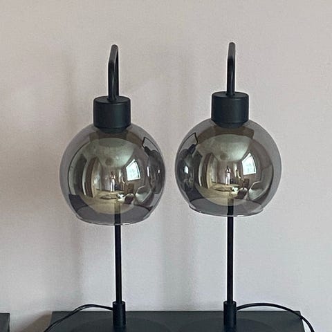 Selger 2 moderne bordlamper med røykfarget glasskuppel og mørk base. Lampene gir et fint og stemningsfullt lys og passer perfekt i stue, soverom eller på en skjenk.