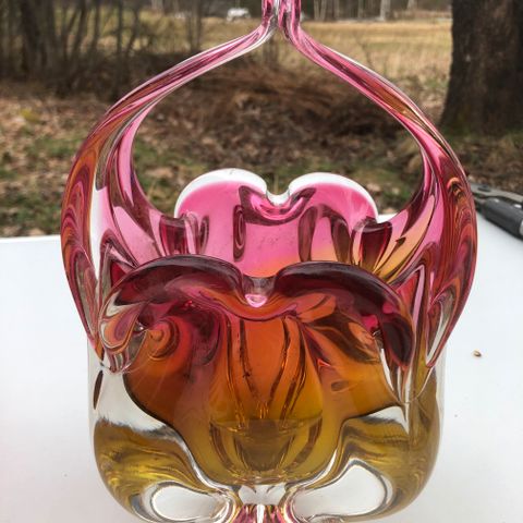 Vintage Josef Hospodka glassvase i flerfarget design med rosa, oransje og klart glass. Vasen har en skulpturell form med buede topper og tykk glasskropp. Egnet som dekorasjonsobjekt eller til blomster. Passer godt på bord, hylle eller i vitrineskap.