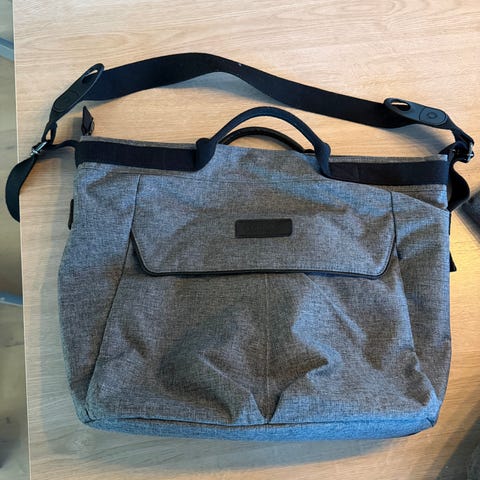 Easygrow stelleveske, mama, i grå tekstil med mange lommer og god inndeling. Vesken har både korte bærehåndtak og avtakbar, justerbar skulderrem. Utvendig finnes flere åpne og lukkede lommer for enkel organisering av utstyr. Innvendig har vesken et mønstret fôr og flere rom og lommer som gjør det praktisk å holde orden på bleier, flasker og annet babyutstyr.