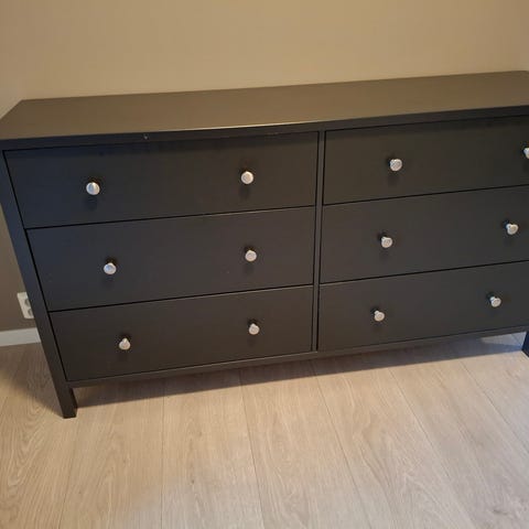 Den er godt brukt, mangler en knott på den lille skuffen øverst til venstre, og den er ripete på toppen.