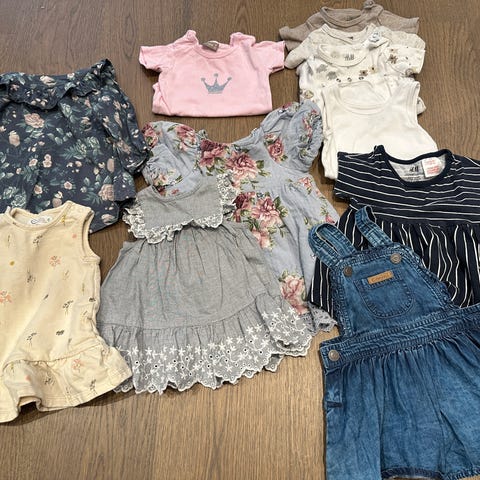 Har flere dresser, jakker og klær til jente. Mye kjoler og sommerklær. Si fra om det er noe du er på utkikk etter da jeg har veldig mye klær liggende til jente mellom str 50 og 74.