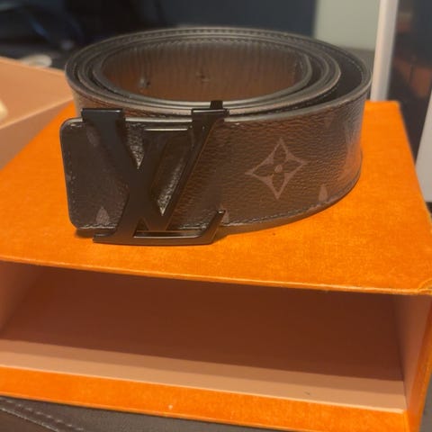 Louis Vuitton belte for unisex med klassisk brun monogram-design. Beltet har gullfarget LV-spenne og justerbare hull. Yttersiden er i monogrammønstret materiale, innsiden i glatt skinn. Leveres med Louis Vuitton-støvpose som vist på bildene. Størrelses- og slitasjedetaljer fremgår av nærbildene av innsiden av beltet.