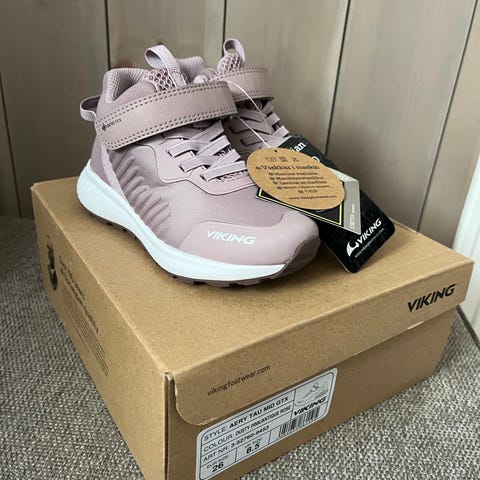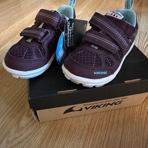 Nye Viking barnesko for jente i størrelse 26. Skoene er i lilla. Modellen har to borrelåsstropper for enkel justering og av- og påtaking. Overdelen er i tekstil med forsterkninger, og skoene har en lett og fleksibel yttersåle i gummi.