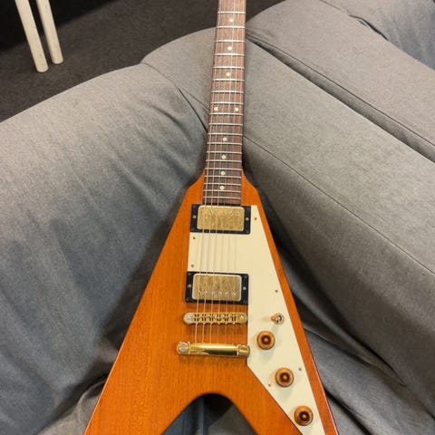 Selger denne kule Flying V-en. Lett og resonant, stabile tunere, og nut, og pickuper som er veldig balansert. Helt original fra 1977, inkludert den originale kassen.