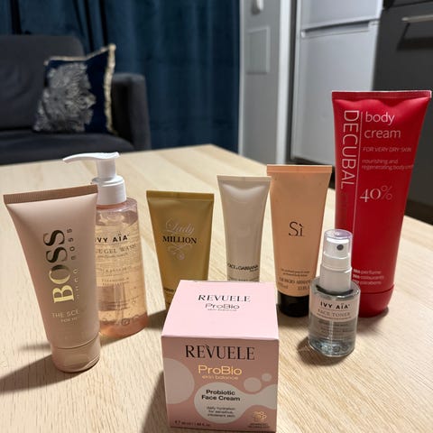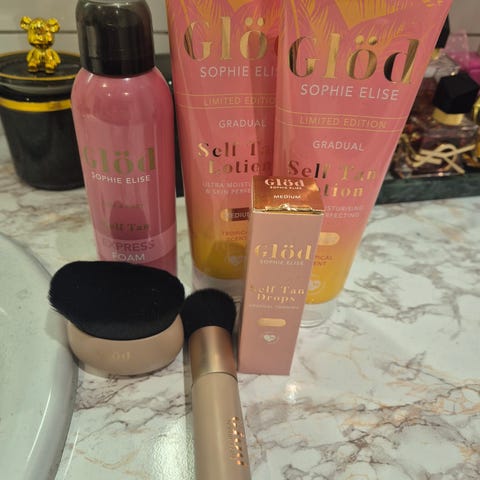Det er også et rosa ansiktssett med myk vaskeklut/etui, ansiktsmaske, ansiktsrulle, applikatorer og leppeprodukt. Tilbehøret inkluderer en gullfarget sovemaske, myk hvit hårbøyle og gjenbrukbare runde bomullspads i hvitt. Settet kan brukes til grunnleggende hudpleie, selvbruning og avslappende egenpleie hjemme. Selger div fra glød. Alt er ubrukt, leppestift 💄 skrudd opp og testet. Totbag følger med. Jeg sender mot postens satser. Pruting blir ikke besvart,