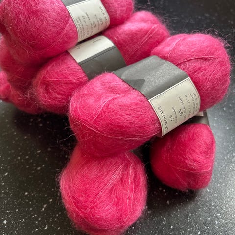 Dale Garn Myk Påfugl garn i fargene rosa (farge 4017) og turkis (farge 7950). Garnet består av 73 % mohair, 22 % ull og 5 % polyamid. Myk Påfugl er et loddent effektgarn som egner seg til blant annet gensere, jakker, sjal og andre plagg eller tilbehør der man ønsker en lett og fluffy struktur. Garnet kan brukes alene eller sammen med andre garnkvaliteter for å gi ekstra volum og tekstur i strikketøyet.