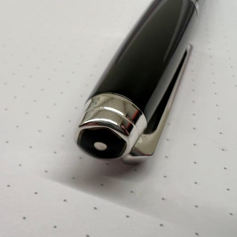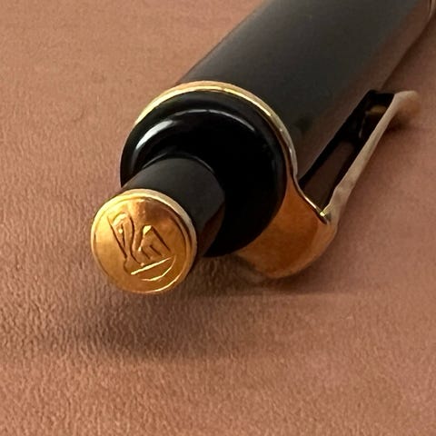 Caran d’Ache Léman fyllepenn, 18k M nib. Older style with etched logo on the top finial.