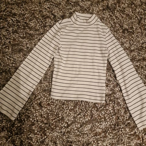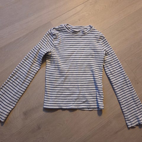 Hvit genseren med blå striper. Genseren har en minimal flekk, rød foran, se bilde. Genseren har morsomme skuldre, se bilde.