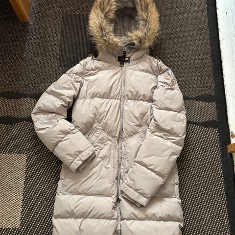 Lys gråhvit knelang kåpe. Lite brukt, en sesong. Ingen merker eller skader. Selges da den ble kjøpt for liten.