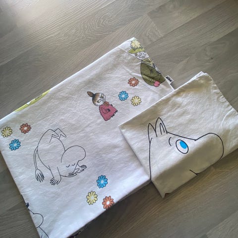 Muumi sengesett for barn i flerfarget design med motiv fra Mummidalen. Sengesettet består av dynetrekk og putevar med ulike Muumi-figurer og husmotiv. Stoffet har trykk med klare farger og detaljerte illustrasjoner. Passer til junior barnedyne og pute.