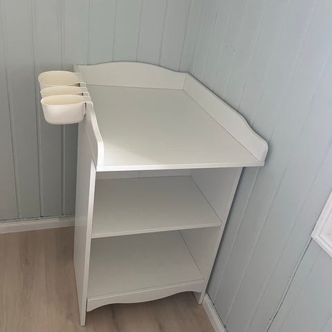 IKEA SMÅSTAD/PLATSA stellebord med bokhylle. Kombinasjonen består av stellebord med stellematte på toppen, flere skuffer og åpne hyller for oppbevaring. Fargekombinasjon i hvit og lys grønn på fronter og sider. Egnet til oppbevaring av babyutstyr, klær, leker og annet tilbehør på barnerommet. Skuffene er med håndtak.