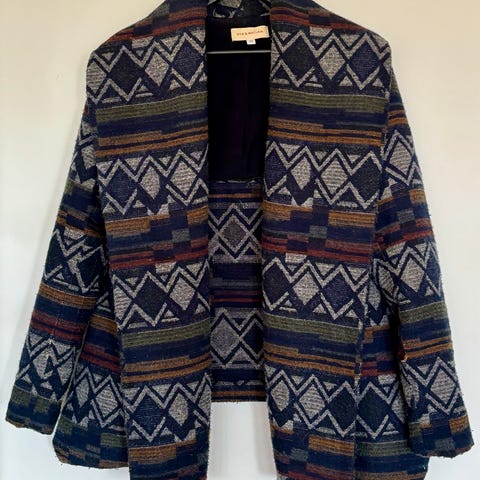 Jakke i størrelse M. Jakken er laget i polyester og har et flerfarget aztekmønster i jordtoner. Modellen har stor krage, belte i livet og lange ermer. Passer som lett ytterjakke til hverdagsbruk.
