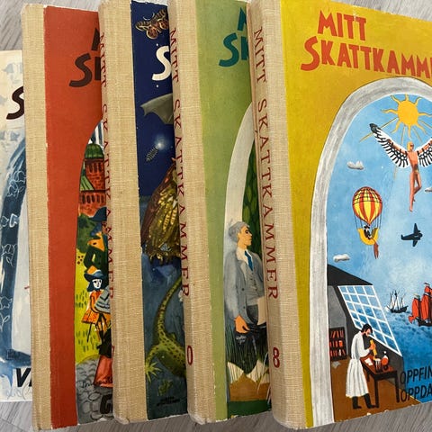 Inneholder flere bind fra serien «Mitt skattkammer», blant annet titler som «Gjennom tidene», «Da de store var små», «Østenfor sol og vestenfor måne» og «Oppfinnelser og oppdagelser». Bøkene har illustrerte permer og er innbundet.