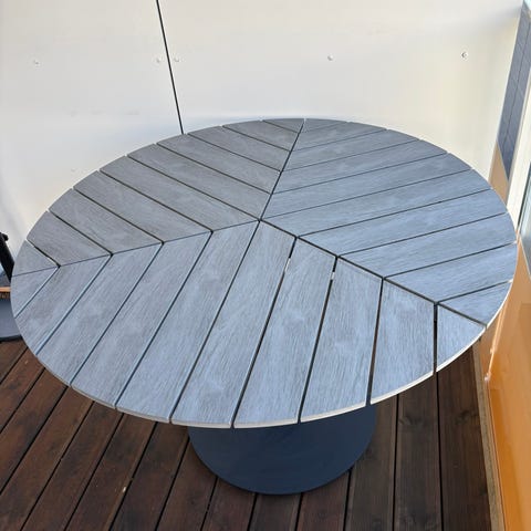 Kompositt bordplate. 113 cm diameter. , 73 cm høy.