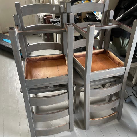 Bord og stoler av eldre årgang gis bort samlet. Fine detaljer og mye potensiale, men trenger litt kjærlighet for å skinne igjen.