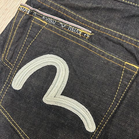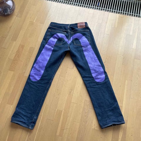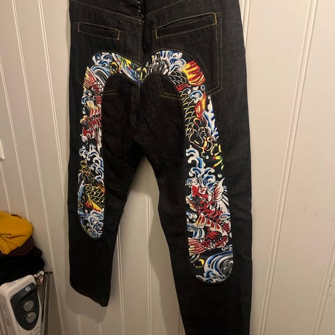 Selger nesten helt nye evisu bukser fra oktober kolleksjonen 2025. Kun brukt 1 gang. Selger fordi den var for stor. Kjøpt på den offisielle Evisu siden.
