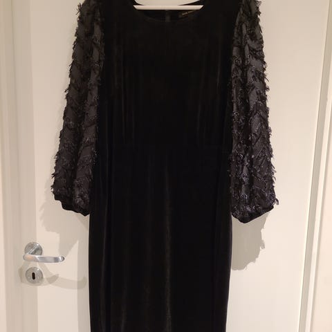 Marie Philippe festkjole for dame i størrelse 44. Kjolen er brun og laget i silke. Modellen har korte ermer, rund hals og en rett passform med leggdetaljer foran og bak. Stoffet har en glatt overflate med lett glans. Egnet som penkjole til selskap og andre anledninger der man ønsker en enkel og klassisk stil.