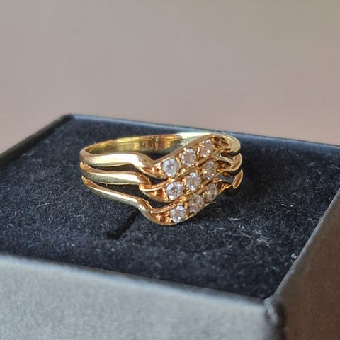585 karat gullring. Vet ikke hva slags steiner de er. Størrelse 60.
