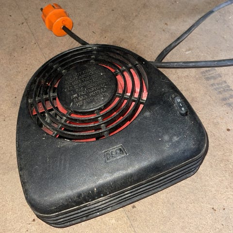 Enheten er utført i svart plast og har innebygd vifte, frontgitter for luftutblås og bryter på toppen.
