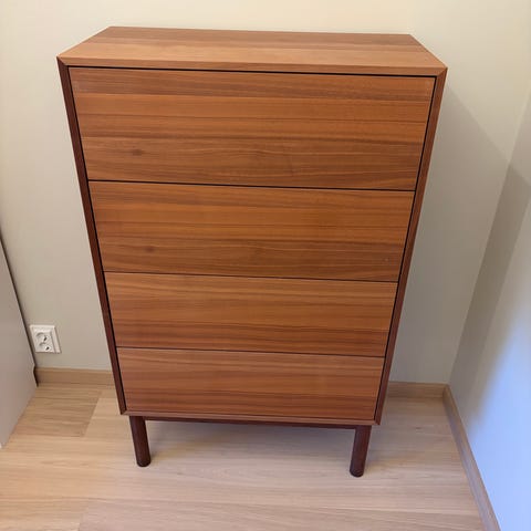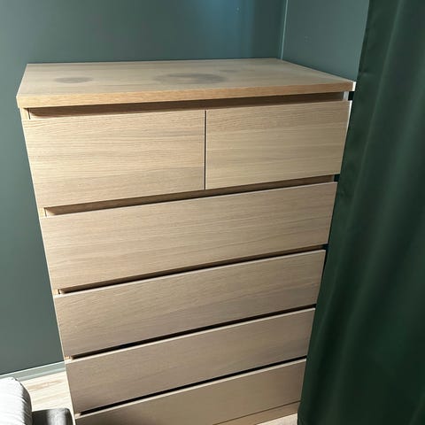 Meget pent brukt Malm kommode med 3-skuffer i eik. Jeg finner ikke noen merker eller skader foruten at de to hjørnene lengst ned mot veggen ble skadet i flytt dessverre. Står den mot en vegg eller hjørne synes disse nesten ikke. Se bilder for tilstand.