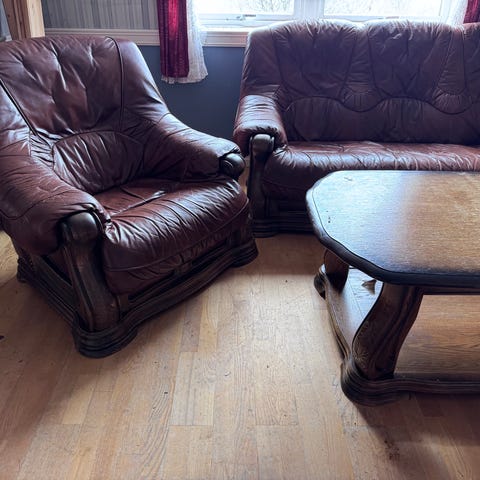 Selger 2 stk 2 seters sofaer, 1 stol og 2 bord.Tilstand ukjent. Noe bruksmerker, men finner ingen rifter i sofa. Bord er noe slitt.