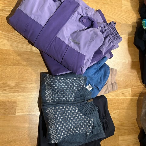 1 vinterdress, 1 parkas, 1 fleece sett, 1 fleece bukse, 2 ull gensere + 1 par ullsokker.