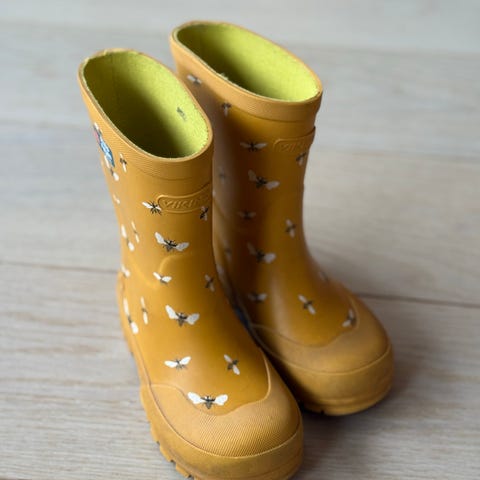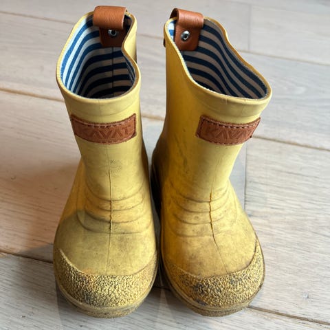 Selger 2x Viking gummistøvler for barn i størrelse 22. Unisex-modell i gul farge med mønster.