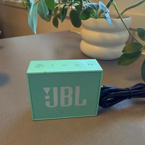 JBL bærbar høyttaler i kompakt rektangulær utforming. Høyttaleren er oransje og har integrerte knapper på siden. Egner seg som portabel lydkilde til mobil, nettbrett eller andre enheter med trådløs tilkobling, avhengig av modellens spesifikasjoner. Praktisk størrelse som gjør den enkel å ta med seg i veske eller sekk.