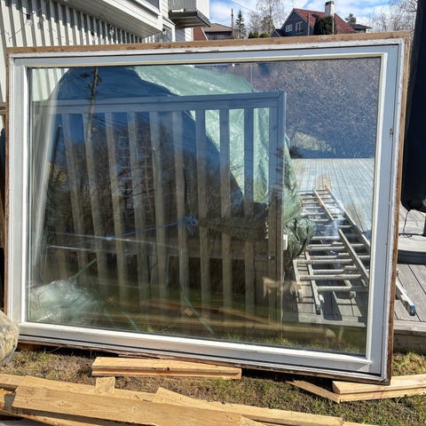 Vindu med hvit ramme. Mål m/ramme: 2 m x 2m. Mål ramme innvendig (vindusglass): 190 cm x 190 cm. Persienne produsert for vinduet følger med.