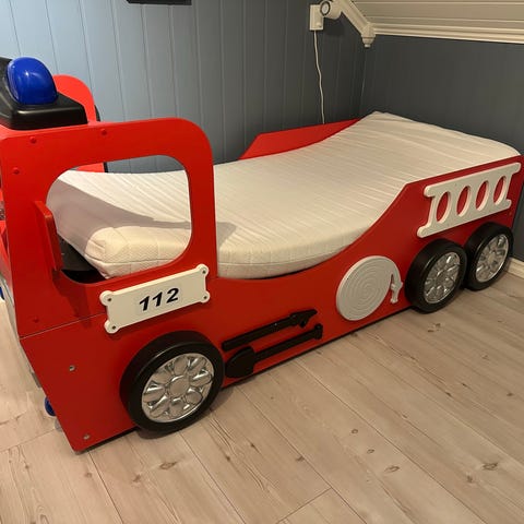 Artig brannbil køyeseng for barn selges grunnet plassmangel. Stort sett bare brukt til å leke i og er i god stand. Skumgummi-madrasser som passer (70x160cm) kan følge med om ønskelig.