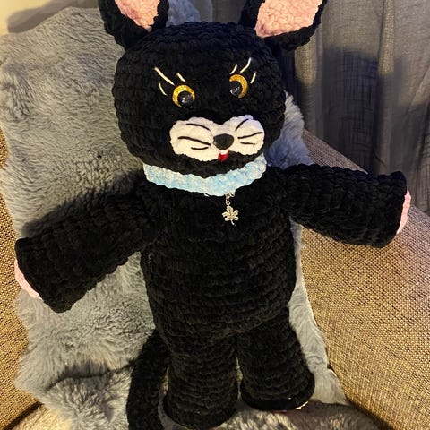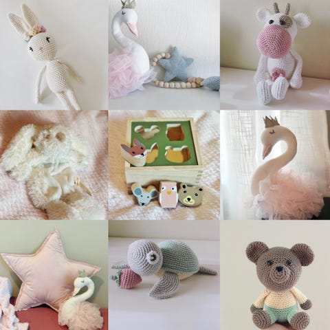Selger ulike søte hjemmelagde bamser og rangle i ulike farger.