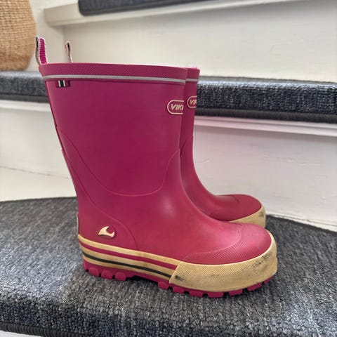 Viking gummistøvler til barn i størrelse 26. Modellen er i rosa farge og passer til jente. Støvlene er laget i vanntett materiale med mønstret såle for bedre grep. Høy skaft gir beskyttelse mot vann og søle. Egnet til bruk i regnvær, på lekeplassen og på tur der det kan være vått underlag.