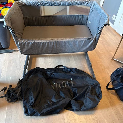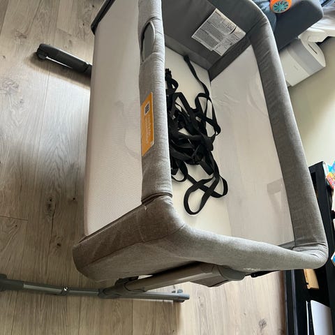 Kinderkraft bedside crib barneseng i grå tekstil. Sengen har nettingfelt på sidene som gir innsyn og lufting, samt justerbart stativ med støtteben. Leveres med madrass og festestropper for montering inntil voksenseng. Egnet som babyseng ved siden av foreldreseng de første månedene.