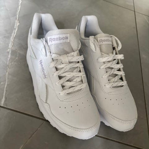 Reebok sneakers i størrelse 38. Modellen er lave joggesko i helhvit farge med snøring. Overdelen er i syntetisk materiale med perforeringer i front for ventilasjon. Sålene er mønstrede for bedre grep. Egner seg til hverdagsbruk og lett aktivitet.
