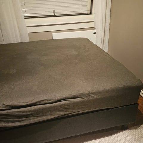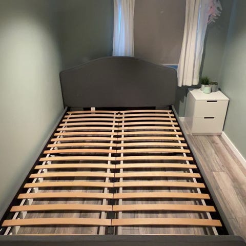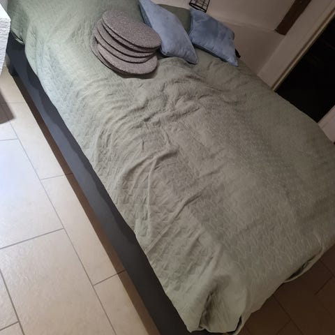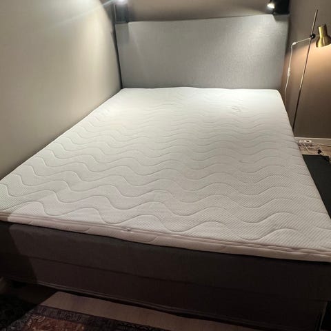 Pent brukt hjemme snekret seng på 150 cm. To madrasser med over madrass. Stått på et gjeste rom.