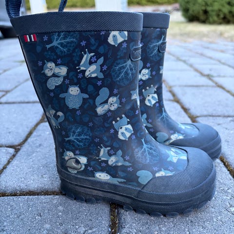 Pent brukt Viking gummistøvler for barn selges. Modell i mørkblå farge med dyremønster, størrelse 33.