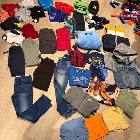 Ikke alt er så mye brukt, men noe av det er litt mer slit men fortsatt fine nok til å brukes. Følger med litt forskjellig men blant annet en skalljakke, bukser, pysjer, gensere og jakker.