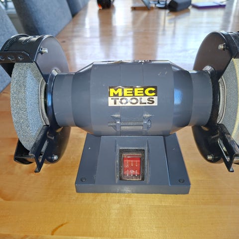 Benkeslipemaskin i metall med grønn lakk. Maskinen har slipehjul på den ene siden og feste for tilbehør på den andre. Monteres på benk via fast sokkel med skruehull. Strømtilkobling med kabel og bryter på fronten. Egnet til sliping og pussing av metall- og verktøydeler i verksted eller garasje.