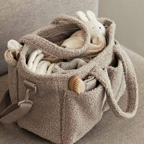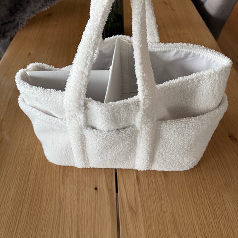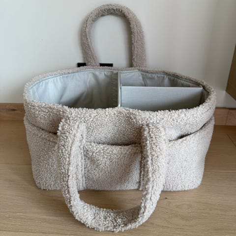 Kjempefin organizer/stellebag i teddy stoff fra HM Home. Har plass til alt man trenger til baby den første tiden og veldig praktisk å kunne ha alt i nærheten. Ingen slitasje eller flekker.