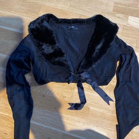 Vakker og elegant bolero for dame i størrelse M. Kort modell med lange ermer i svart stoff med diskret glittereffekt. Materiale: 82 % nylon og 18 % metallfiber. Åpen front med knyting i halsen. Passer som lett jakke eller bolero over topp, kjole eller bluse.