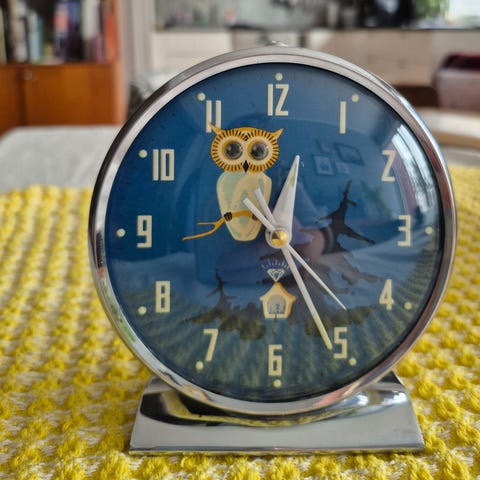 Rundt veggur med sølvfarget ramme og motiv av bygater med veteranbiler og fotgjengere. Tallskiven er et fototrykk i hovedsak svart‑hvitt med enkelte fargeelementer. Uret har tre visere, med sekundviser i rød farge. Passer som veggklokke i stue, kjøkken, kontor eller garasje og kan brukes som dekorativt innslag for den som liker klassiske by- og bilmotiver. Virker! Flott for Volvo Pv entusiaster og Boble Fans! Kan sendes men ikke fiks ferdig!