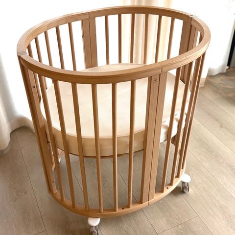 Stokke Sleepi sprinkelseng i lyst tre. Oval seng med justerbar bunnhøyde og hjul for enkel forflytning. Passer til baby og småbarn. Madrass og beskyttelseslaken følger med. Dyne og pute selges for kr. 500.
