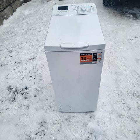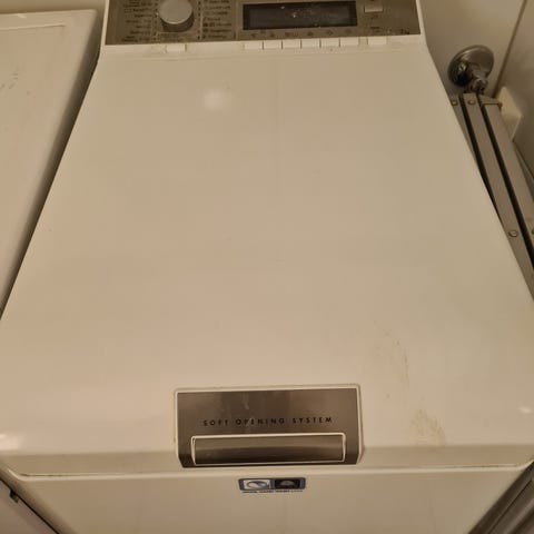 Toppmatet modell fra Whirlpool med lokk på oversiden og trommel som åpnes fra midten. Maskinen betjenes fra kontrollpanel øverst, og har standard funksjoner for klesvask. Egnet for plassering der det er begrenset gulvplass eller hvor frontåpning ikke er praktisk.