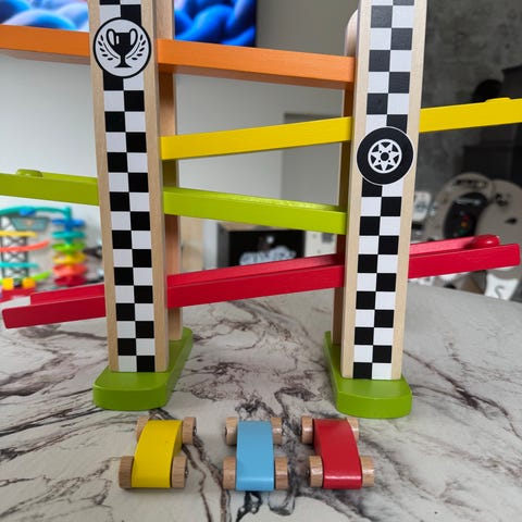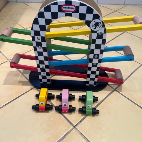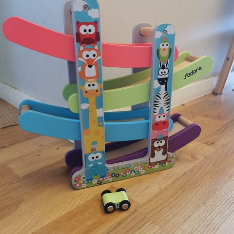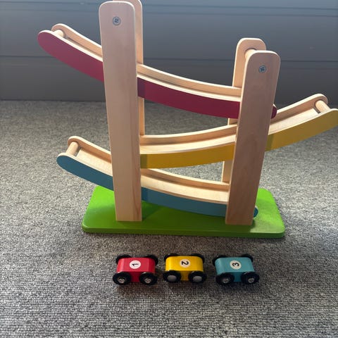Søt bilbane i tre med 4 biler, pent brukt. Høyde ca 28 cm, lengde ca 32 cm.