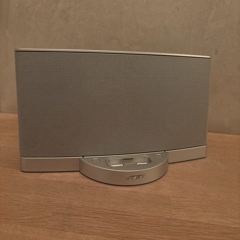 Bose SoundDock digital høyttaler med integrert dokkingstasjon for tidligere apple-enheter. Kompakt bordmodell med frontdekket høyttalergrill og dokk i front. Strømtilkobling på baksiden. Egnet som stasjonær høyttalerløsning i for eksempel stue, kjøkken eller soverom.