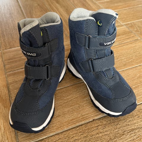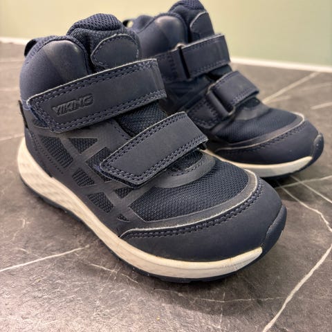 Viking barnesko i størrelse 21. Skoene har høy modell med borrelåsremmer for enkel av- og påkledning. Fargekombinasjon i blått med mørke detaljer og lys såle med godt mønster under for bedre grep.